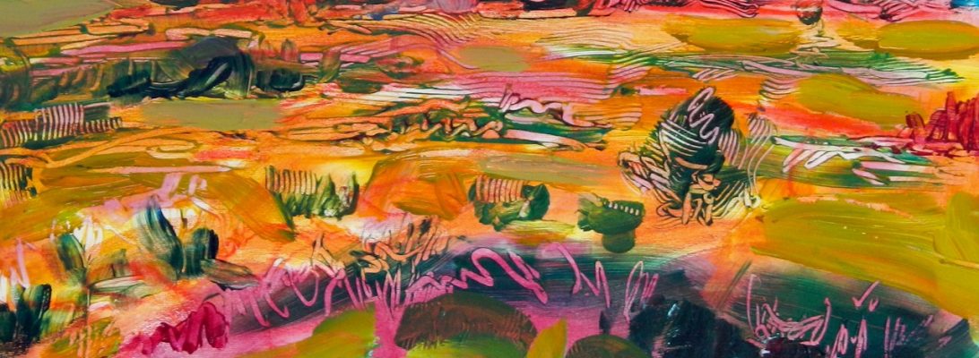 Finally, I draw the scene using a rubber tipped shaper. This technique is called sgraffito. I add a few more colours and at this point it is a push and pull effort. I try to keep the freshness of the colours as well as building up a contrast and creating a pattern of colour that goes through the entire painting.